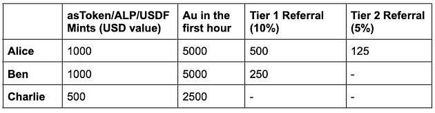 Tier 1 referral: Get 10% of your invitees’ Au points when they mint asTokens, USDF and/or ALP. Your invitees must bind your invite code before their first mint.
