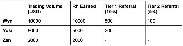 Yuki trades 5,000 USD volume. She earns 5,000 Rh.